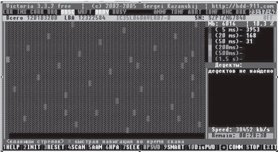 Следующим мощным инструментом программы является сканер поверхности HDD. Он позволяет проверить HDD на наличие сбойных участков, плавающих дефектов и ошибок интерфейса. Одной из особенностей сканера является автоматическое распознавание поддерживаемых стандартов и настройка таймера в соответствии с быстродействием тестируемого HDD.