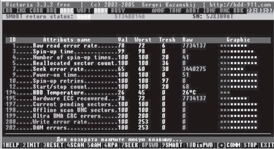 Технология мониторинга и предсказания отказов HDD была введена в практику более 10 лет назад и сейчас активно используется. На основе уже заложенных в микропрограмму самоконтроля HDD данных и используя информацию с датчиков, которая снимается ежедневно, она вычисляет предполагаемое "время жизни" HDD. Эта опция вызывается клавишей F 9. На экран выводится информация для каждого атрибута (рис. 6).