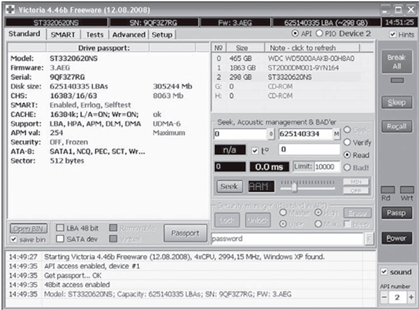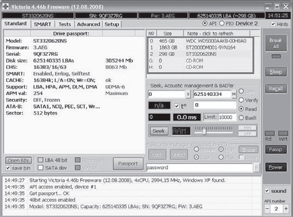 На этой вкладке (Standard) можно получить основную информацию о HDD: модель, прошивку, серийный номер и другие дополнительные данные. Для того чтобы программа считала данные о диске, нажимают кнопку "Passport".