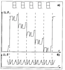 Пилообразное напряжение для принятой последовательности обхода матрицы электронным лучом на экране ЭЛТ (рис. 6) формируется во 2, 3, 5, и 6-м тактах по оси Y и в 1, 4, 7-м тактах по оси X в соответствии с рис. 11.