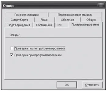 3. Открывают меню "Настройки", в котором выбирают строку "Опции", а затем вкладку "Программирование" (см. рис. 4), устанавливают галочку в строке "Проверка при программировании" и нажимают "Ok".