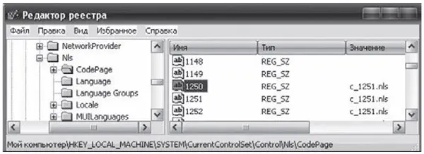 Рис. 8. Окно редактора реестра regedit.exe с открытой папкой кодовых страниц (CodePage)