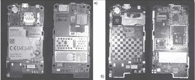 Рис. 1. Плата оригинальной модели Nokia 6500 slide (а) и подделки под нее (б)
