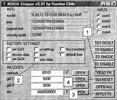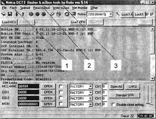 Нажимают кнопку READ PH (1 на рис. 5), и в ранее пустых окнах программы появится информация о версии ПО телефона, типе аппарата, дате его изготовления, IMEI-номерах (в EEPROM и FLASH), коде телефона (заводская установка кода -12345), состоянии блокировок.