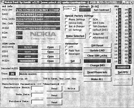 Следующий пакет с аналогичным названием - Nokia Tool, но от другого производителя @Bullet- = Jordik. Его окно показано на рис. 7. Он используется для снятия блокировок, замены IMEI-кодов и сброса телефона на заводские установки.