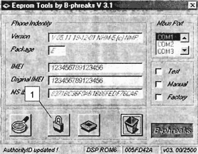 Программа EEPROM TOOL является идеальным инструментом для разблокировки телефонов (если, конечно, аппарат не находится в состоянии CONTACT SERVICE). Например, если в телефоне была полностью перезаписана Flash-память - он, естественно, будет заблокирован (4 lock) и у него будет неправильный IMEI-номер. С помощью этой программы можно быстро выполнить разблокировку аппарата (кнопкой 1), а затем восстановить IMEI-номер.