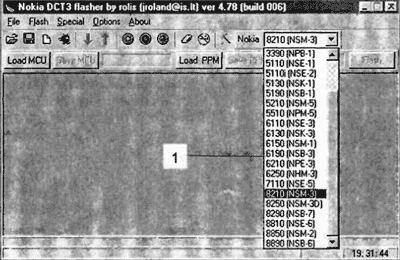 В окне 1 этой программы выбирают модель аппарата (в скобках дано его сервисное название). Затем выбирают файл "прошивки", область памяти и затем, собственно, записывают этот файл в телефон. С помощью этого пакета можно записать как оригинальную (что была ранее), так и более позднюю версию ПО телефона.