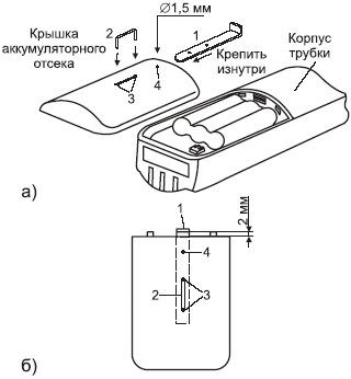 В заготовке сверлят (или пробивают) два отверстия диаметром около 1 мм, а затем изгибают язычок защелки. Пластину крепят к внутренней стороне крышки с помощью обычной канцелярской скобки 2 (рис. 1). Предварительно в крышке по месту сверлят два отверстия 3 диаметром около 1 мм, между которыми с помощью режущего инструмента (например, заточенным концом надфиля, или куска ножовочного полотна, и т.п.) прорезают неглубокую канавку, чтобы скобка не выступала из нее. Отверстие 4 диаметром 1,5-2 мм сверлят у края крышки так, чтобы через него можно было, нажав на пластину сверху каким-либо металлическим стержнем (например, шилом, гвоздем, и т.п.), отжать защелку и открыть крышку.