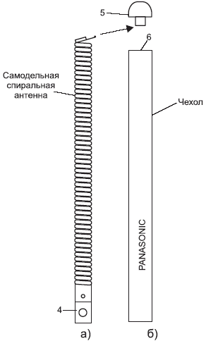 Подобную самодельную спиральную антенну, рис. 4, можно использовать взамен сломанной телескопической (например, в модели КХ-ТС1025 и других). Как показала практика, пользоваться трубкой с телескопической антенной неудобно, так как последняя быстро ломается. Для замены в имеющийся на трубке пластмассовый чехол (рис. 4б) вставляют спираль, припаяв ее нижний конец к металлическому основанию 4, которое осталось от сломанной телескопической антенны.
