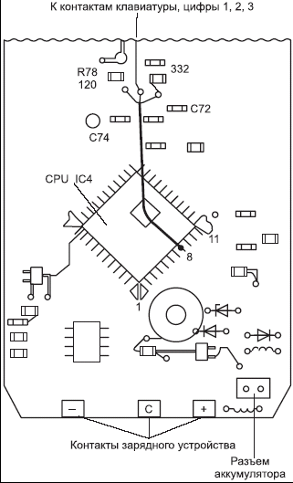 Подобное часто происходит с трубками моделей КХ-ТС155В, КХ-ТС157В и близких к ним по конструктивному устройству. Например, во многих трубках PANASONIC в результате сильного давления на нижние кнопки клавиатуры часто происходит обрыв проводника под контактным слоем кнопки FLASH. В результате чего, помимо этой кнопки, не работают и клавиши 1, 2 и 3. Иногда это происходит и в других моделях с различными контактными площадками и перемычками, нанесенными таким же слоем на наборном поле плат. Попытки восстановить контакт путем зачистки этого слоя и пайки т.п. успеха не имеют. Как показала практика, в этих случаях наиболее надежным методом ремонта является восстановление необходимого соединения с обратной стороны платы. В данном случае (для моделей КХ-ТС1558 и КХ-ТС1578В) выв. 8 микропроцессора (CPU) необходимо соединить с анодом диода D34 либо с проводящей площадкой на плате, как показано на рис. 5. Для этого лучше использовать отрезок провода ПЭВ-2 диаметром 0,12-0,15 мм.