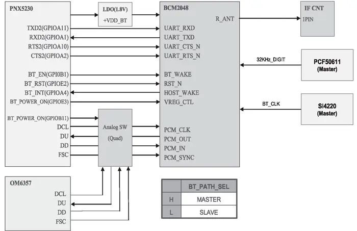 Модуль Bluetooth (BCM2048) (см. схему подключения Bluetooth модуля на рис. 2) активируется при поступлении сигналов с процессора Master В/В. Соединение с данной микросхемой осуществляется через последовательный интерфейс UART. Модуль питается напряжением 1,8 В (VDDBT), которое дополнительно стабилизируется регулятором LDO (1.8V). Модуль использует генератор на 32 кГц из состава микросхемы питания Master PMU PCF50611 и тактируется от микросхемы SI4220. Аналоговый коммутатор Analog SW соединяет модуль Bluetooth с одним из сигнальных процессоров Slave В/В или Master В/В для организации направления передачи по шине ИКМ (PCM: Clk, Out, In, Sync).