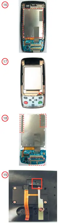 18. Снимают три проводящих пленки с дисплея и с платы дисплея (рис. 3-18).