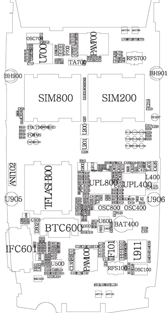 Рис. 5. Расположение элементов на основной печатной плате телефона (вид снизу)