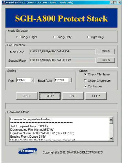 Рис. 1. Основное диалоговое окно WinTdn(M) v 2.0 (SGH-A800 Protect Stack)