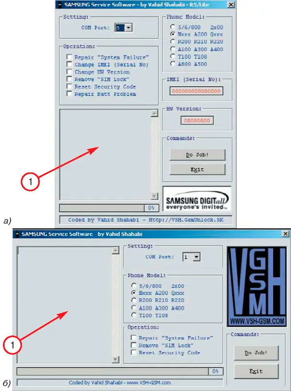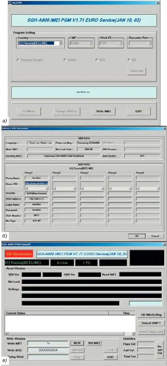Программа Samsung Service Software является сервисной утилитой, поддерживающей большую часть телефонов Samsung SGH на базе аппаратной платформы VLSI, а также некоторые телефоны первого семейства GSM-телефонов Samsung. Существует несколько версий данной программы, отличающихся функционально, но имеющих одинаковый интерфейс пользователя. Диалоговые окна двух наиболее распространенных версий Samsung Service Software приведены на рис. 3а и 3б. Работу с программой осуществляют в следующей последовательности: