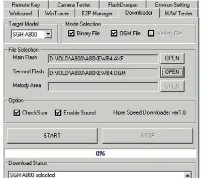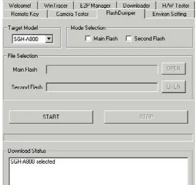 Для программирования Flash-памяти VLSI-телефонов в программе ToolBox v. 5.0 предназначена вкладка "Downloader" (рис. 7). Загрузка информации во Flash-память телефона осуществляется по методике, аналогичной сохранению дампа памяти: выбирают модель телефона, отмечают флажками программируемые области памяти, указывают имена файлов, загружаемых в телефон, фиксируют клавишу включения телефона в нажатом положении и нажимают кнопку "START". По окончании программирования телефона нажимают кнопку "STOP".