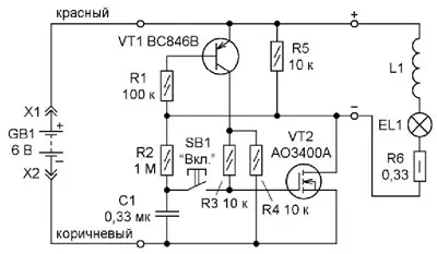 Модернизированный фонарь (рис. 3) работает так. При нажатии на кнопку SB1 "Вкл." её контакты замыкаются, контроллер на плате автоматики срабатывает, управляющее напряжение через резистор R2 поступает на базу транзистора VT2, который открывается и подаёт минусовый потенциал на базу транзистора VT1, который также открывается и подаёт плюс напряжения питания через дроссель L1 и переключатель SА1 на лампу EL1. Лампа EL1 загорается. Если кнопку SB1 при включении фонаря держать нажатой несколько секунд, то лампа EL1 станет мигать. При повторном нажатии на кнопку SB1 лампа EL1 отключается. Дроссель L1 на схеме - это уже имеющийся штатный дроссель на плате автоматики фонаря.