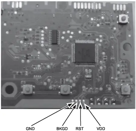 Рис. 9. Точки подключения BDM-программатора к плате модуля стиральных машин Indesit/Hotpoint-Ariston (аппаратная платформа ARCADIA, МК типа MC9S08GB60(А))