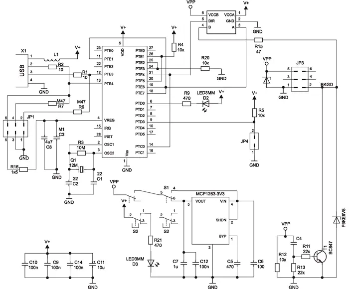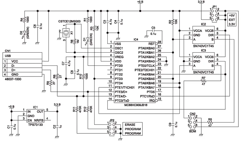 - IC4 (MC68HC908JB16) - управляющий МК. Он обеспечивает функционирование всех узлов программатора. Данный МК относится к другому семейству HC08 и программируется через отладочный интерфейс MON08 (см. [1]);