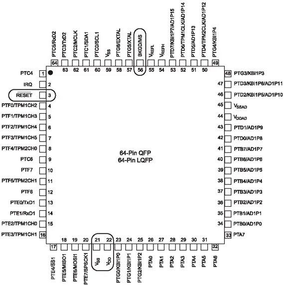 Выше уже перечислялись выводы BDM-программатора, которые подключаются к внешнему МК. В зависимости от типа МК расположение выводов для подключения может различаться. Но в этом никаких сложностей не возникает, так как выводы (интерфейс) программатора и контрольные точки МК на разных устройствах обозначаются практически одинаково. На примере МК MC9S08AW60 выделены точки подключения программатора (см. рис. 8). Чтобы избежать в будущем ошибок при подключении программатора, нужно ознакомиться с соответствующими материалами на конкретный тип МК (например, см. [7]).