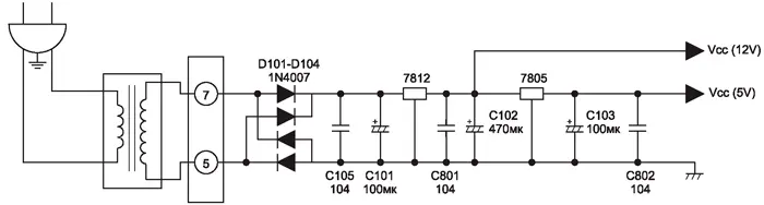 Источник питания (ИП) электронных модулей холодильников SAMSUNG серии RL33 выполнен по линейной схеме и формирует постоянные стабилизированные напряжения 5 и 12 В. Принципиальная схема источника питания показана на рис. 1. В его состав входят сетевой трансформатор, выпрямитель и интегральные стабилизаторы (выполнены, соответственно, на микросхемах типов 7805 и 7812).