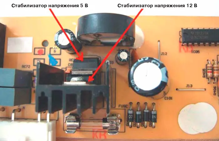 Основной проблемой, связанной с отказами этого источника, является выход из строя стабилизатора напряжения канала питания 12 В. Естественно, одновременно с этим пропадает питание по каналу 5 В. Как ни странно, при этом не перегорает предохранитель, стоящий между выходом вторичной обмотки трансформатора и входом выпрямительного моста. Стабилизатор напряжения 7812 из-за повышенной нагрузки перегревается и со временем выходит из строя. Его не спасает даже прикрепленный к корпусу относительно массивный теплоотвод. Данная проблема решается установкой нового радиатора с увеличенной площадью рассеивания (площадь должна быть увеличена, как минимум, в два раза). Расположение стабилизаторов напряжения на плате показано на рис. 2.