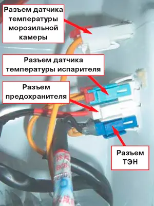 - датчик морозильной камеры подключается непосредственно к соединителю электронного модуля и не имеет промежуточных разъемов. Поэтому при замене датчика необходимо отрезать его соединительные провода;