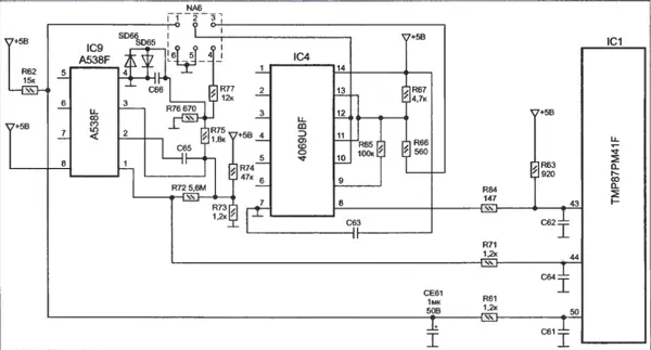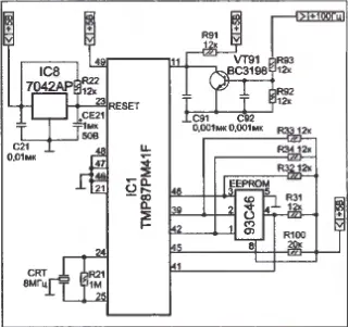 - Микропроцессор IC1 типа ТМР87РМ41F фирмы TOSHIBA (рис. 5). Он является основным управляющим компонентом модуля. Микропроцессор имеет 8-битное ядро, встроенные ОЗУ и ПЗУ объемом 1 и 32 кбайт соответственно, а также 10-битный 16-ка-нальный АЦП, 2-канальный ШИМ, 16- и 8-битный таймеры, сторожевой таймер и др. Он выполнен в 64-выводном корпусе QFP64-P-1420-1.00А. Работоспособность микропроцессора в рассматриваемом модуле обеспечивают схема начального сброса на микросхеме IC8 типа 7042АР (ее выход подключен к выв. 23 IC1), кварцевый резонатор CRT частотой 8 МГц (подключен к выв. 24, 25 IC1) и усилитель-формирователь тактовой частоты 100 Гц на транзисторе Q91 (выход этого каскада подключен к выв. 11 IC1,входной сигнал снимается с диодного моста D81-D84).