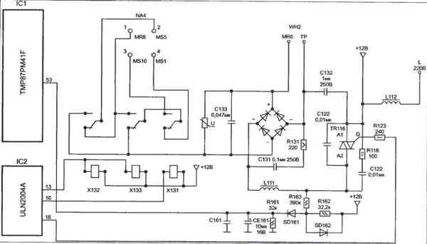 реле реверса приводного мотора XI31, XI33. Они служат для изменения фазы включения статорной обмотки мотора (для обеспечения реверсивного вращения барабана СМ в режиме стирки). Реле управляются от микропроцессора по следующей цепи (в скобках для цепи реле Х133): выв. 3 (6) IC1 - выв. 7 (4) и 10 (13) IC2 - обмотка реле Х131 (Х133). Оба реле - типа OMI-SH-112L(UHOM=12B,