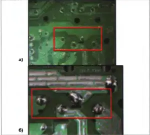 Рис. 15. Качество пайки контактов реле в старых (а) и новых (6) версиях электронных модулей
