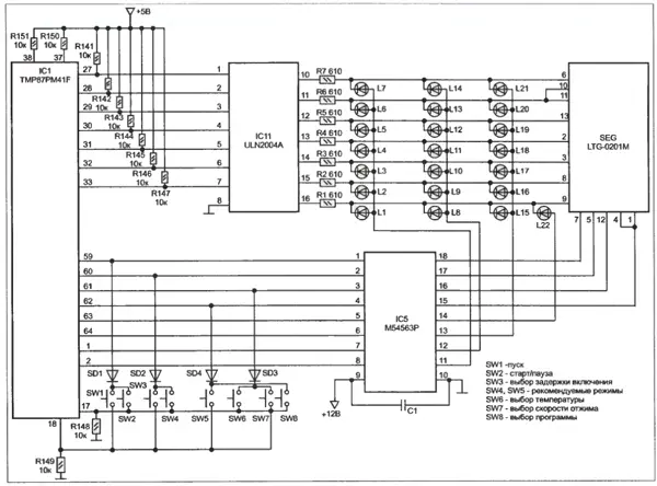 - 7-канальные интегральные транзисторные ключи IC2, IC3 типа ULN2004A. Они используются в качестве буферных элементов в цепях управления обмоток реле и симисторов. Кроме того, ULN2004A (IC11) входит в состав платы управления и индикации в качестве буферного формирователя строк матрицы индикации (см. рис. 7). Отметим, что в составе этой платы есть еще одна 8-ка-нальная сборка ключей М54563Р. Она выполняет функцию усилителя столбцов матрицы индикации.