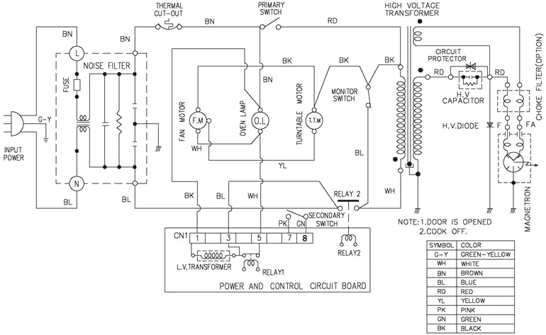 Рис. 9. Схема соединения силовых электрических узлов печи, где: INPUT POWER - сетевая вилка; NOISE FILTER - сетевой фильтр; THERMAL CUT_OUT - тепловой предохранитель; FAN MOTOR - мотор вентилятора; TURNTABLE MOTOR - мотор поворотного круга; OVEN LAMP - лампа освещения камеры; PRIMARY SWITCH - основной выключатель; MONITOR SWITCH - контрольный выключатель; SECONDARY SWITCH - вторичный выключатель; HIGH VOLTAGE TRANSFORMER - высоковольтный трансформатор; H.V. CAPACITOR, H.V. DIODE - высоковольтные конденсатор и диод соответственно; CIRCUIT PROTECTOR - схема защиты; CHOKE FILTER - высоковольтный дроссель; MAGNETRON - магнетрон (типа 2М214-240GP), POWER AND CONTROL CIRCUIT BOARD - плата питания и управления с низковольтным трансформатором (L.V. TRANSFORMER), двумя реле (RELAY1 и RELAY2), микроконтроллером (МК), зуммером, клавиатурой и светодиодной индикаторной сборкой и др. узлами и элементами.