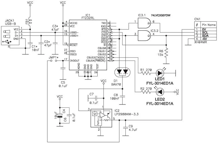 - исключают микросхему IC2, в этом случае замыкают перемычку JMP1. Эта перемычка подключает к схеме встроенный в микросхему IC1 стабилизатор 3,3 В. Однако при подобном схемном решении подключать программатор в "горячем" режиме нельзя, так как в случае внешнего замыкания по питанию (ток более 50 мА) выйдет из строя микросхема IC1 (во встроенном в микросхему стабилизаторе 3,3 В отсутствует защита по току);