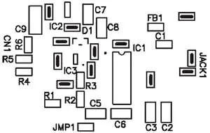Устройство собрано на однослойной печатной плате размером 45,7x29,2 мм под стандартную корпусную коробку BOX-KA16 (50x35x22 мм), которая доступна в торговых сетях по продаже радиокомпонентов. В устройстве используются компоненты, предназначенные для поверхностного монтажа (SMD), кроме C4, CN1, LED1, LED2, JACK1, которые устанавливаются с другой стороны платы. Рисунок печатной платы с видом снизу (bottom) показан на рис. 3, на рис. 4 - расположение компонентов на этой же стороне платы (прямоугольники с чертой - это перемычки), а на рис. 5 - расположение компонентов с внешней стороны платы.