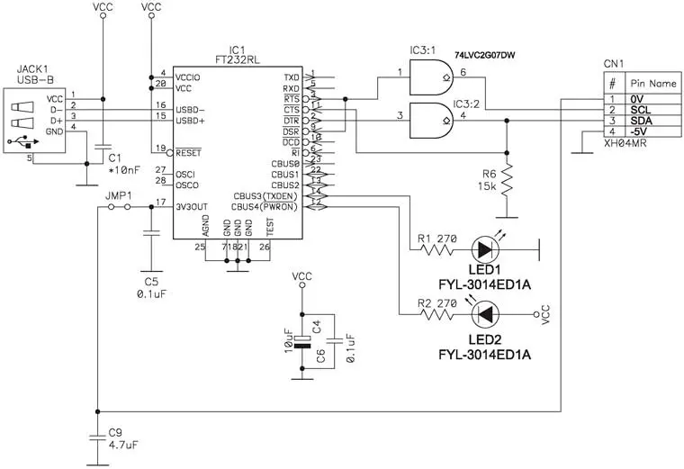3. Микросхема IC3 (74LVC2G07DW) представляет собой 2-канальный буферный формирователь с открытым стоком и выполняет функцию согласования выходов IC1 с линиями шины I2C. Также этот формирователь позволяет подключать информационные линии программатора к нагрузке (ЭМ, микросхеме памяти) в "горячем" режиме.