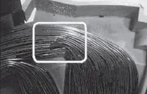 Занижены все вторичные напряжения с ИБП: напряжение питания В+ равно 35 В, питание микросхемы EEPROM около 2 В. После отключения цепи В+ от нагрузки остальные напряжения пришли в норму, ТВ переключился в РР слышна характерная работа КР ("гудение" 50 Гц от кадровых катушек ОС). Проверка выходного транзистора СР типа MD1803DFX выявила пробой перехода "база-эмиттер" (диагностируется омметром после отключения транзистора от схемы ввиду "шунтирования" вторичной обмоткой ТМС) и незначительную "утечку" между выводами "коллектор-эмиттер". При этом, до отключения цепи В+, транзистор СР перегревался, но ИБП не переключался в режим защиты (дополнительный косвенный признак - перегрев разрывного резистора по цепи питания В+). После замены транзистор снова очень сильно нагревается (более 75-80°С). Причина неисправности в строчных катушках ОС: после снятия на них обнаружены следы окисла (см. рис. 2). Никаких нарушений геометрии растра при этом не наблюдалось. После замены ОС нагрев транзистора находился в пределах 55-60°С. Дефект встречался неоднократно, поскольку при сборке в ТВ были установлены бывшие в употреблении кинескопы от мониторов [5].